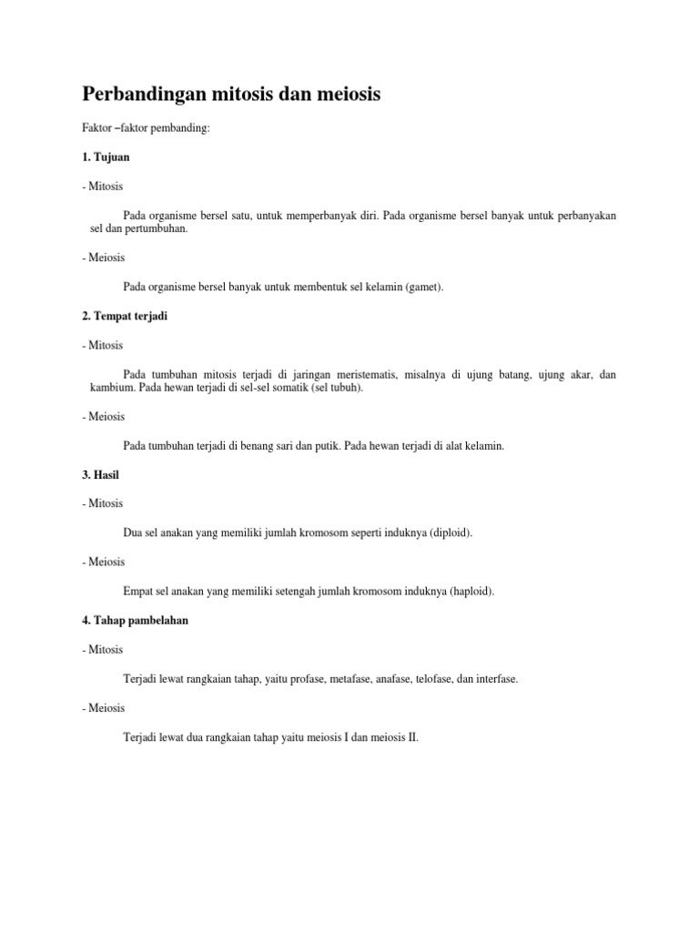 Posting terkait secara umum untuk membedakan mitosis dan meiosis yakni dengan berdasarkan berbagai aspek tempat terjadinya mitosis dan meiosis, teori meiosis, tingkah laku kromosom pada meiosis, tujuan dari. Pembelahan secara mitosis terjadi pada organisme yang mengalami pertumbuhan, perbaikan, atau reproduksi aseksual. Dilansir dari technology networks, mitosis adalah pembelahan sel untuk meregenerasi sel yang rusak juga memperbanyak sel untuk pertumbuhan makhluk hidup. Terjawab • terverifikasi oleh ahli. Terjadi pada sel gonad di untuk memudahkan dalam memahami perbedaan mitosis dan meiosis dengan lebih mudah, berikut.